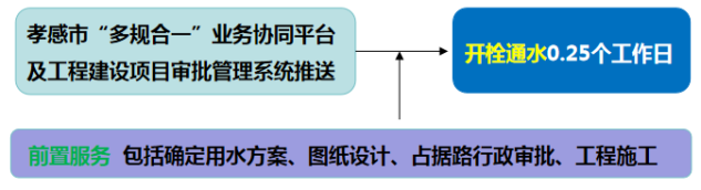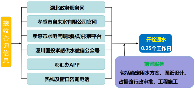 流程說明:供水企業(yè)通過孝感市“多規(guī)合一”業(yè)務(wù)協(xié)同平臺及工程建設(shè)項(xiàng)目審批管理系統(tǒng)推送獲取項(xiàng)目建設(shè)信息后主動(dòng)對接,先行開展確定用水方案、圖紙?jiān)O(shè)計(jì)、工程施工等服務(wù),辦理用水工程涉及的占道、掘路、占用綠地、伐移樹木等相關(guān)行政審批手續(xù),提前完成外線工程實(shí)施,為客戶提供“無感免申請”服務(wù)??蛻粜枰盟畷r(shí),0.25個(gè)工作日內(nèi)開栓通水。