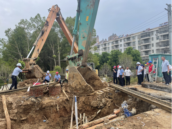 17日清晨開始,50余名各方人員和10余臺(tái)工程機(jī)械設(shè)備繼續(xù)增援、先后到場(chǎng),現(xiàn)場(chǎng)邊排水邊開挖,并按照多套搶修方案分頭準(zhǔn)備。