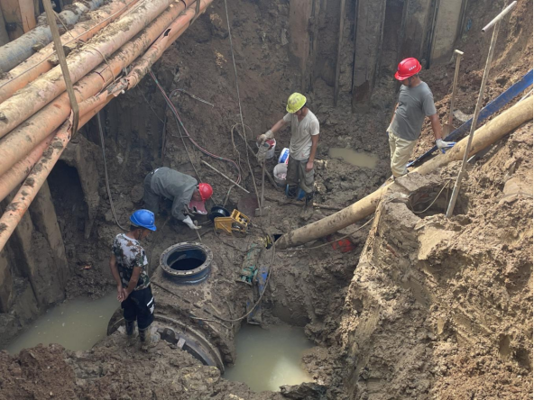 晚上9點(diǎn),公司第一時(shí)間派出10余名搶修人員迅速到場(chǎng)關(guān)閘止水,三水廠暫停供水。與此同時(shí),技術(shù)人員、施工人員和設(shè)備設(shè)施“跑步前進(jìn)”、同步到場(chǎng),對(duì)破損溢水點(diǎn)進(jìn)行邊開挖、邊診斷。由于情況復(fù)雜,晚上24點(diǎn),3臺(tái)大型挖機(jī)、樁機(jī)進(jìn)場(chǎng),20余人到場(chǎng)增援,清理作業(yè)面。市政府組織市住建局、澴川國(guó)投、供電公司、燃?xì)夤炯纯探M成技術(shù)專班,會(huì)同公司技術(shù)人員和一線工人現(xiàn)場(chǎng)制定搶修方案。