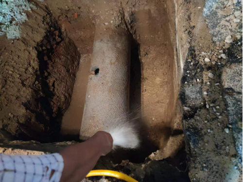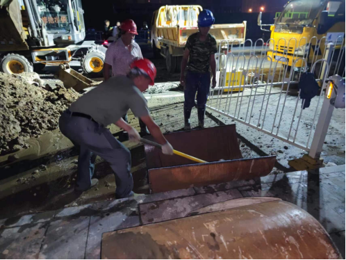 在快速挖開(kāi)路面找出供水主管道后,經(jīng)技術(shù)人員現(xiàn)場(chǎng)分析判斷,確定此次DN600供水主管道被施工損壞是因孝武大道道路改造施工導(dǎo)致,其施工人員操作啄木鳥(niǎo)時(shí)不慎將水泥供水管道挖破。隨后技術(shù)人員迅速制定了維修方案,即采用DN800鋼管抱箍,快速水泥填充的方式修復(fù)。為縮減搶修時(shí)間,運(yùn)行維護(hù)部共派出各類(lèi)工程車(chē)輛5輛,搶修人員18名參與到此次搶修任務(wù)中。盡管已到深夜,氣溫仍接近30攝氏度,但搶修人員不顧疲勞和炎熱,搶時(shí)間、趕進(jìn)度,通宵作戰(zhàn),終于在11日早上6點(diǎn)完成搶修任務(wù),順利通水。