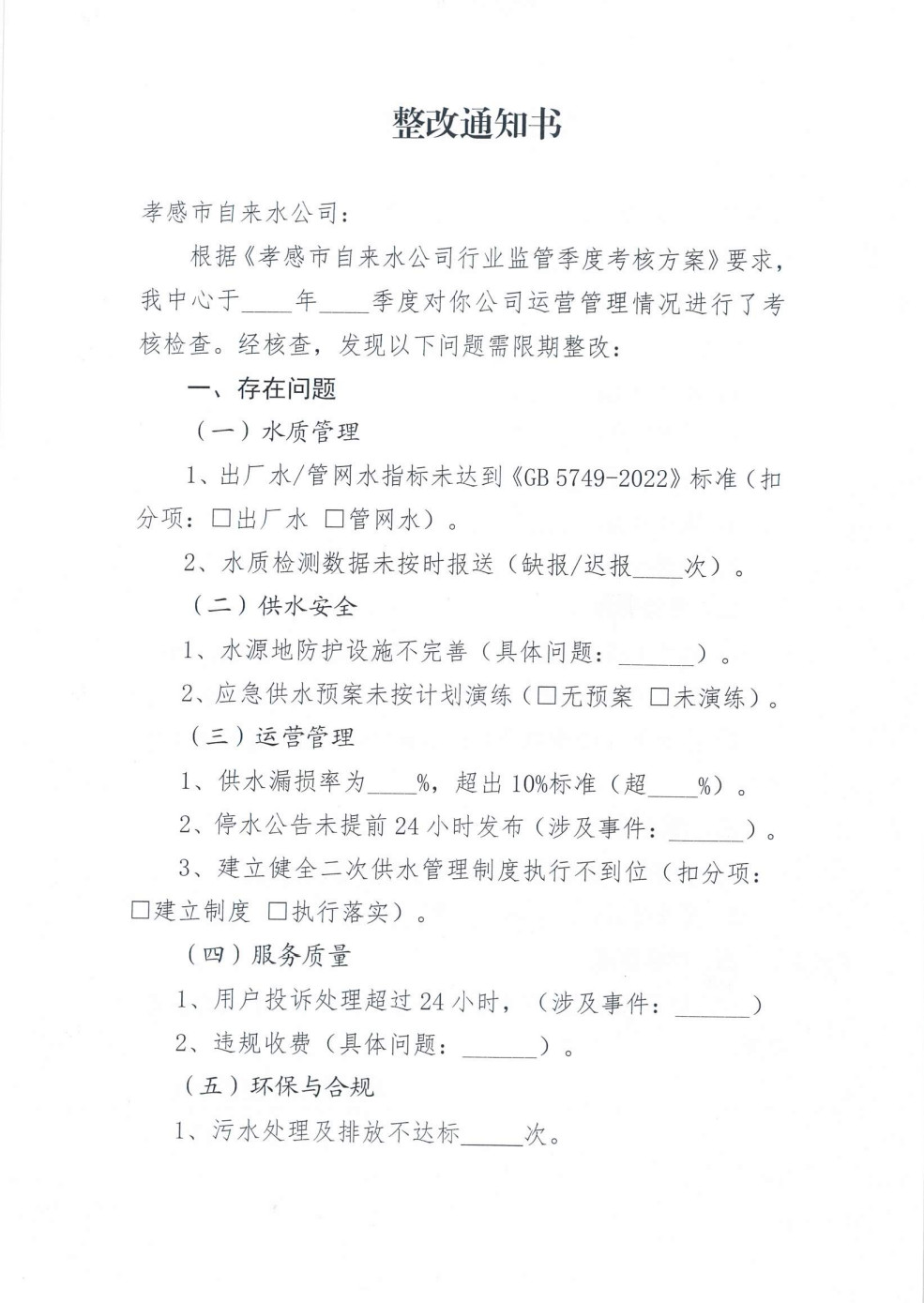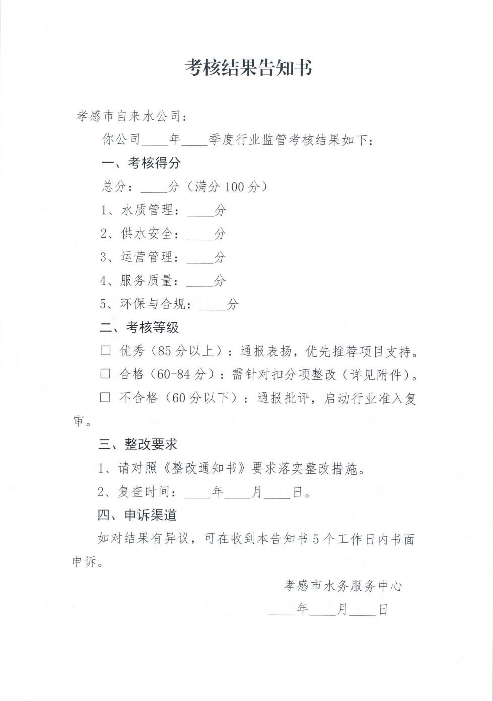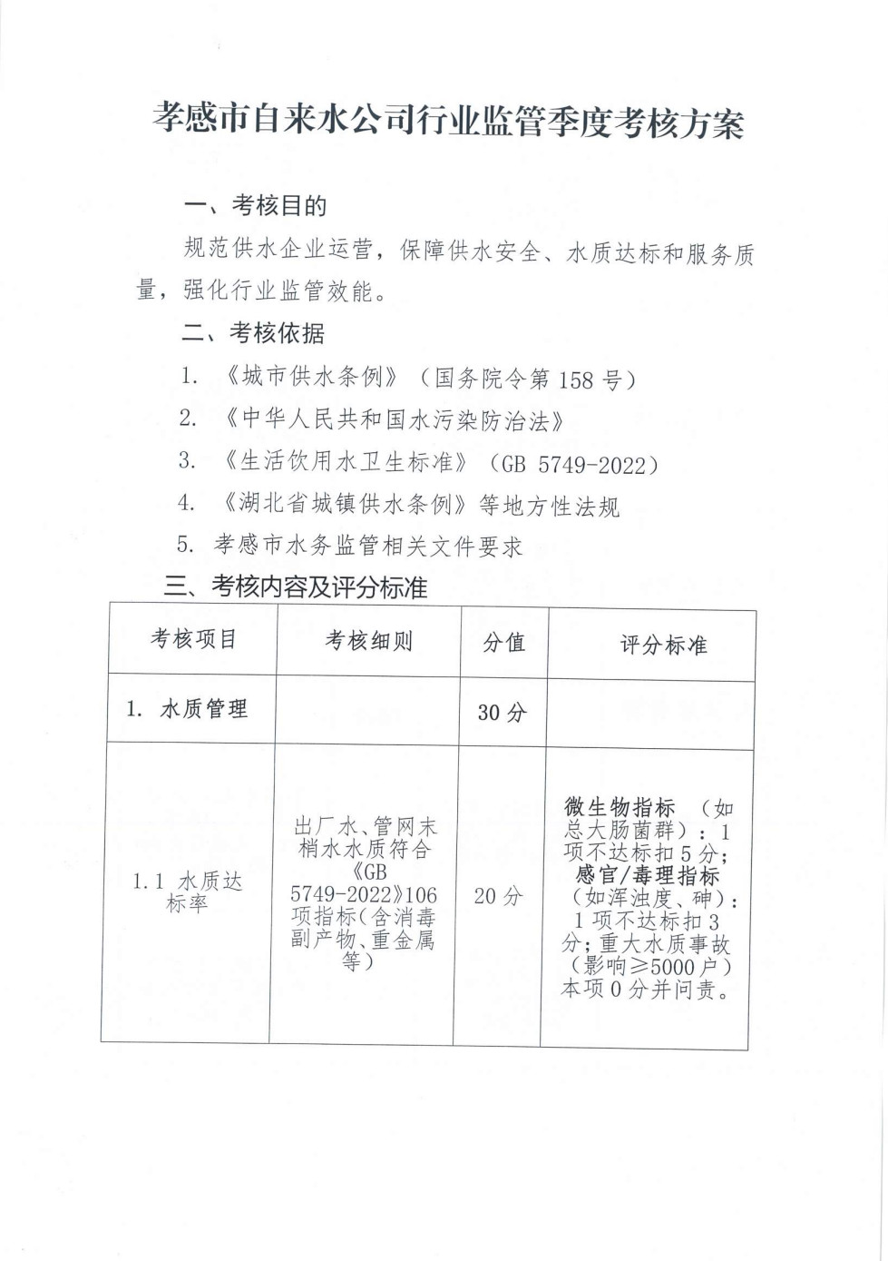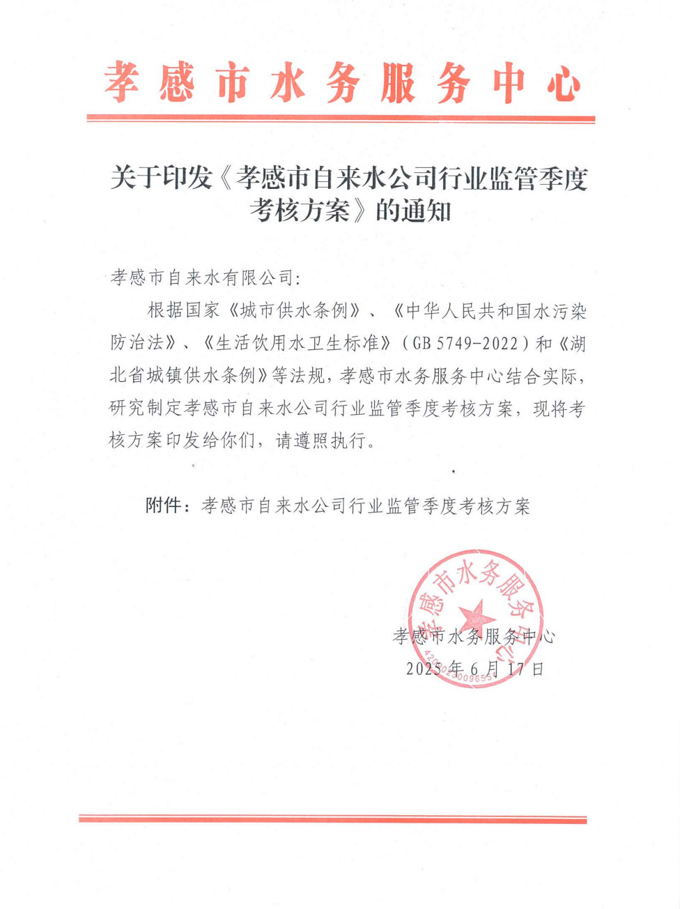 關(guān)于印發(fā)《孝感市自來(lái)水公司行業(yè)監(jiān)管季度考核方案》的通知