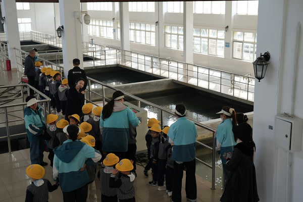 為貼合幼兒認(rèn)知特點(diǎn),公司精心安排了4名專業(yè)講解員、10名引導(dǎo)員及6名安全員,全程保障活動(dòng)安全有序開展。在講解員生動(dòng)通俗的引導(dǎo)下,孩子們分組依次參觀了反應(yīng)池、沉淀池、濾池、清水池、送水泵房及調(diào)度室等核心生產(chǎn)區(qū)域,親眼見證了“渾濁原水”變身“潔凈自來(lái)水”的奇妙過(guò)程。在反應(yīng)池和沉淀池,講解員用“魔法藥劑”的生動(dòng)比喻,向孩子們講解混凝劑的作用,引導(dǎo)大家觀察水中雜質(zhì)凝結(jié)成絮狀物并沉淀的過(guò)程;在濾池,工作人員現(xiàn)場(chǎng)演示過(guò)濾原理,讓孩子們直觀感受水的凈化效果;在清水池,孩子們了解到潔凈水的儲(chǔ)存與調(diào)配方式;在送水泵房和調(diào)度室,自動(dòng)化供水設(shè)備、城市供水管網(wǎng)實(shí)時(shí)運(yùn)行畫面,讓孩子們真切感受到城市供水系統(tǒng)的智慧與高效,讀懂了每一滴水從水廠到家中水龍頭的完整旅程。