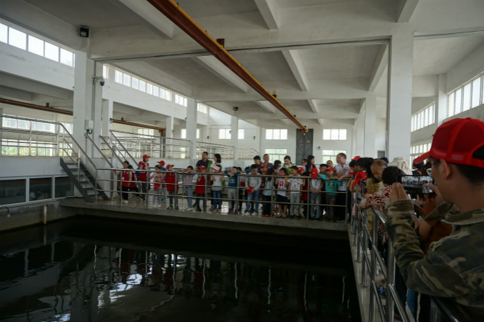 來到寬闊狹長的平流沉淀池邊,小記者們親眼看到在高分子聚合氯化鋁的作用下,原本渾濁的源水一點點變得清澈透明。在過濾車間,他們認真觀察濾池反沖洗和水質(zhì)變化的過程;走進送水泵房,他們在水泵機組轟鳴的運行聲中,細心傾聽處理好的干凈自來水是如何送到千家萬戶的。