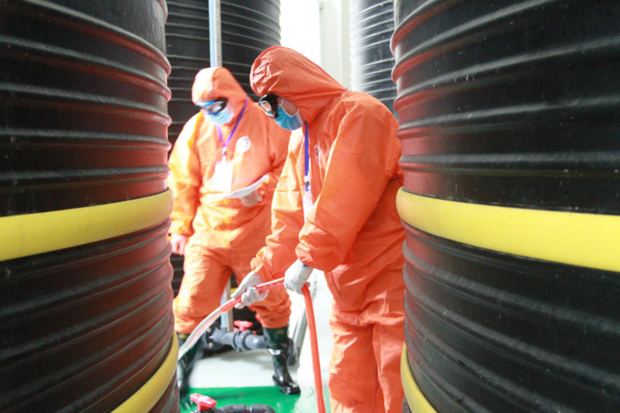 到達事故發(fā)生現(xiàn)場,醫(yī)療救護組迅速將受傷人員轉移至安全區(qū)域,按救護要求進行現(xiàn)場應急救護,并同時撥打120急救電話,將傷者送醫(yī)院救治。隨后現(xiàn)場處置組搶修人員穿戴防護服進入事故現(xiàn)場,關閉相連儲液罐的聯(lián)通閥門并找到漏點,用專業(yè)工具進行堵漏,在漏點周圍圍堰攔截泄漏的次氯酸鈉,并進行稀釋、中和,然后收集處理最后將罐體中的剩余次氯酸鈉溶液轉至備用罐中。在確認事故現(xiàn)場漏點無泄漏后匯報給現(xiàn)場總指揮。演練結束后,現(xiàn)場指揮進行了總結,認真分析了演練過程中暴露出的一些問題,為處置預案的進一步完善提供了一手資料。