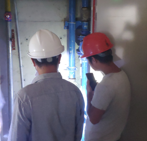 驗(yàn)收小組依次巡查了用水閘閥,入戶水表,供水管道,供水井蓋,二供泵房、樓頂水箱等供水設(shè)施,施工方全程參與。本次驗(yàn)收中發(fā)現(xiàn)4處管道井安裝不合格,部分管道油漆標(biāo)識(shí)不清晰,入戶水表前后管徑不一致、二供泵房未做防鼠設(shè)施等問(wèn)題,當(dāng)即要求施工方整改。